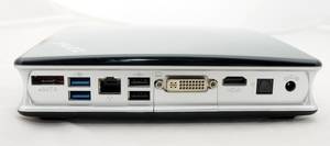 Die Anschlussmöglichkeiten der Zbox HD AD02 sind vielfältig. Auf der Vorderseite befinden sich zwei LED-Leuchten, die auf die Aktivitäten der Festplatte bzw. der WiFi aufmerksam machen, als auch der Power-Knopf. Hinzu kommt ein USB 2.0 Port, ein Lautsprechereingang, ein Mikrofoneingang sowie ein Kartenlesegerät (SD/SDHC/MMC/MS/MS Pro/xD). Auf der Oberseite befindet sich, neben Löcher, welche für eine bessere Lüftung sorgen, ein weiterer USB 2.0 Anschluss. Zur Übertragung der Bildsignale steht neben einem DVI-Port auch noch ein HDMI-Anschluss bereit. Ein Gigabit-LAN Anschluss dient zur Kommunikation im Netzwerk. Dazu kommen zwei moderne USB 3.0 Ports sowie zwei USB Anschlüsse der älteren Generation. Im Handbuch ist zwar nur die Rede von USB 2.0 Ports, doch dabei handelt es sich offensichtlich nur um einen Druckfehler. Ein eSATA-Port (6 Gbit/s) fehlt ebenso wenig wie ein optischer Tonausgang. Einziger Kritikpunkt sind hier die fehlenden analogen Tonausgänge auf der Rückseite. Denn die meisten Lautsprecher haben nur einen analogen Anschluss und optisch sieht es nicht besonders schön aus, wenn ein Kabel bis zum Front-Panel gezogen werden muss.
